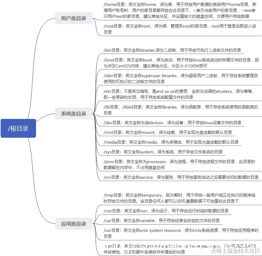 Linux的目录大体分为三种:用户类目录、系统类目录、应用类目录(这个划分只是笔者个人以方便理解划分,没有任何官方权威)。用户类目录两个,root目录是root账户使用,home目录给普通用户使用,home目录下每一个用户有一个用户名命令的目录,就是这个用户的;系统类目录有/bin目录用于二进制可执行文件,/boot目录与启动相关,/sbin目录是系统管理配置,/etc目录是系统配置文件,/lib目录、/lib64目录是函数库,/dev目录是设备,/mnt目录和/media目录是挂载,/sys目录是存放文件系统,/proc目录是进程信息,/svc目录是服务信息;应用类目录与程序运行挂钩,/tmp目录、/run目录和/var目录都是运行时改变内容,/usr目录和/opt目录是给用户使用的,一般都没有系统级的东西。