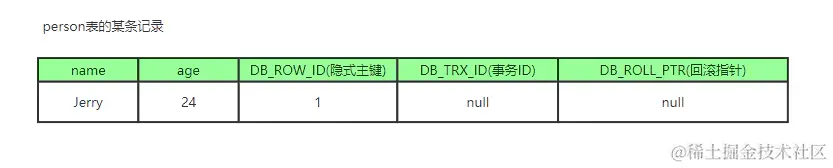 一、 比如一个有个事务插入persion表插入了一条新记录,记录如下,name为Jerry, age为24岁,隐式主键是1,事务ID和回滚指针,我们假设为NULL