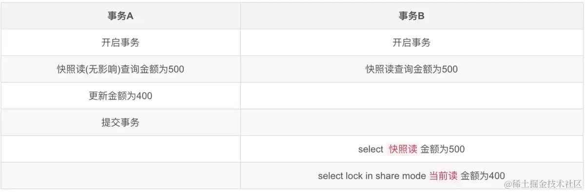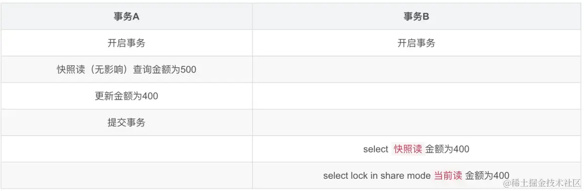 - 这里与上表的唯一区别仅仅是表1的事务B在事务A修改金额前快照读过一次金额数据,而表2的事务B在事务A修改金额前没有进行过快照读。