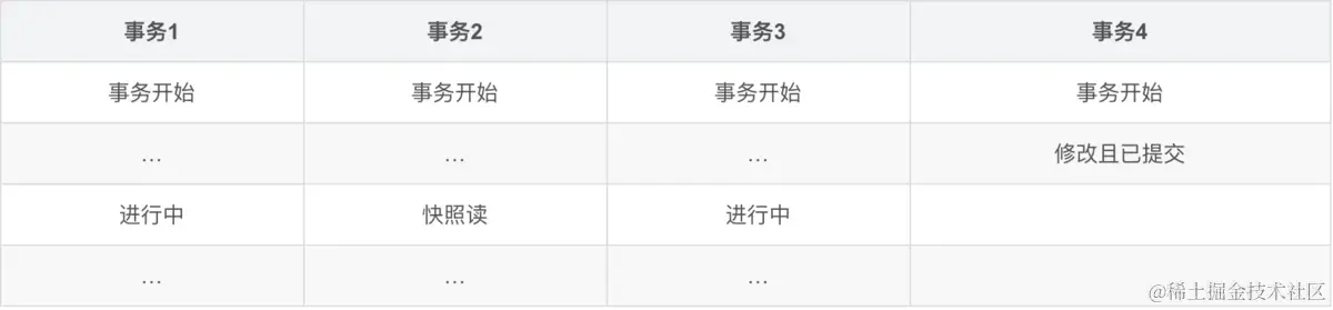 当事务2对某行数据执行了快照读,数据库为该行数据生成一个Read View读视图,假设当前事务ID为2,此时还有事务1和事务3在活跃中,事务4在事务2快照读前一刻提交更新了,所以Read View记录了系统当前活跃事务1,3的ID,维护在一个列表上,假设我们称为trx_list