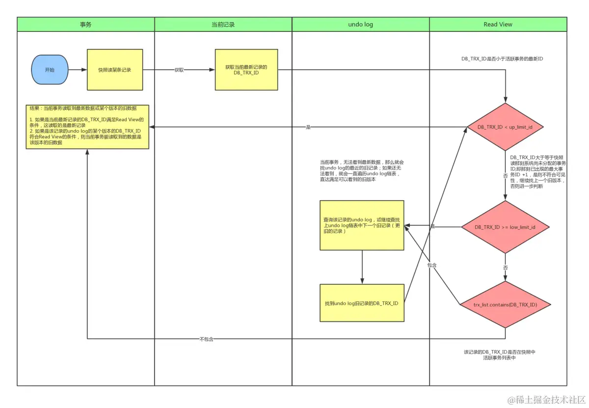Read View遵循一个可见性算法,主要是将要被修改的数据的最新记录中的DB_TRX_ID(即当前事务ID)取出来,与系统当前其他活跃事务的ID去对比(由Read View维护),如果DB_TRX_ID跟Read View的属性做了某些比较,不符合可见性,那就通过DB_ROLL_PTR回滚指针去取出Undo Log中的DB_TRX_ID再比较,即遍历链表的DB_TRX_ID(从链首到链尾,即从最近的一次修改查起),直到找到满足特定条件的DB_TRX_ID, 那么这个DB_TRX_ID所在的旧记录就是当前事务能看见的最新老版本