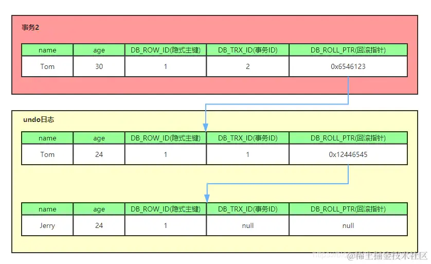 修改该行age为30岁,并且修改隐藏字段的事务ID为当前事务2的ID, 那就是2,回滚指针指向刚刚拷贝到undo log的副本记录