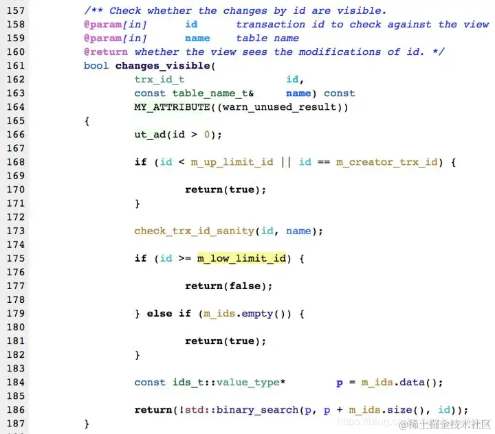 如上,它是一段MySQL判断可见性的一段源码,即changes_visible方法(不完全哈,但能看出大致逻辑),该方法展示了我们拿DB_TRX_ID去跟Read View某些属性进行怎么样的比较