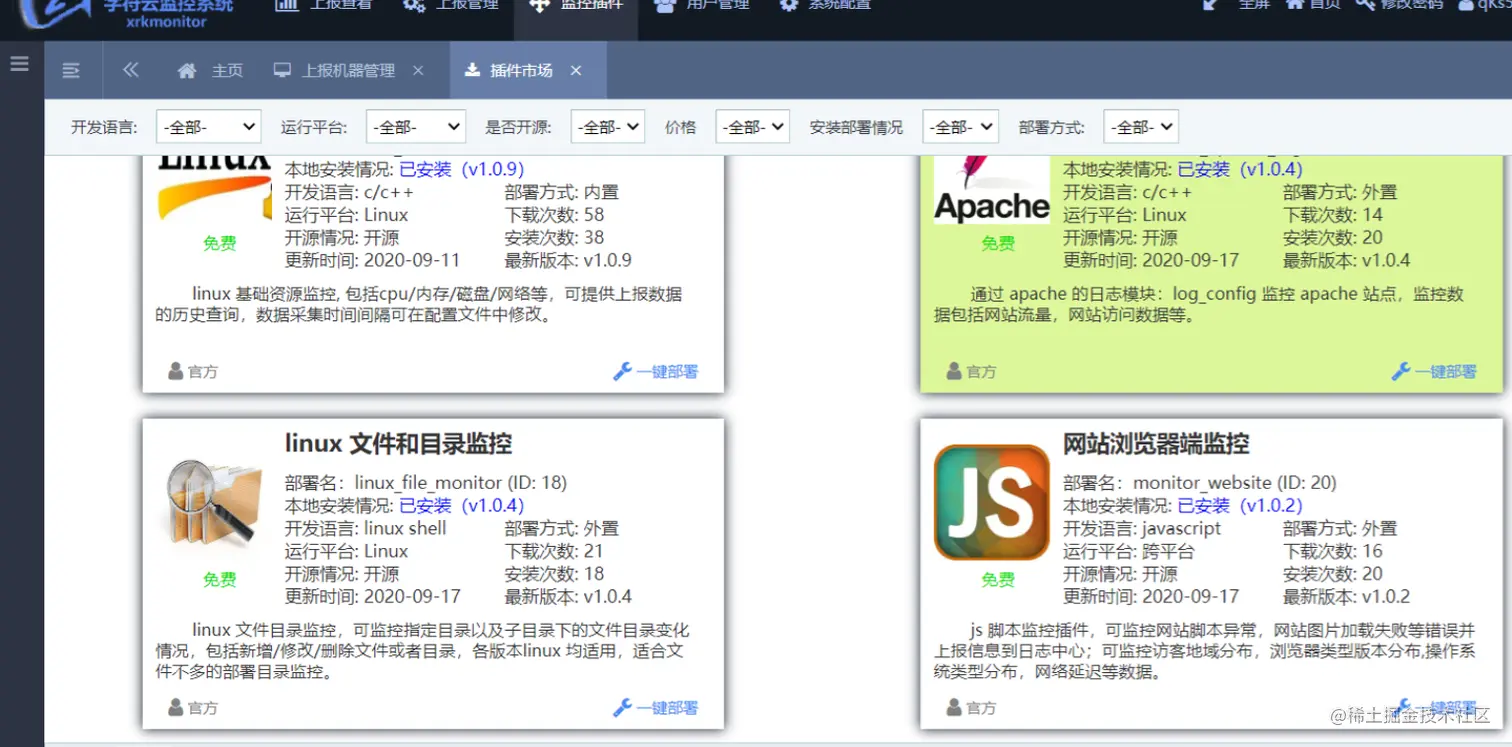 - 支持插件功能, 监控插件无需开发,自由选择监控插件,控制台安装即可使用