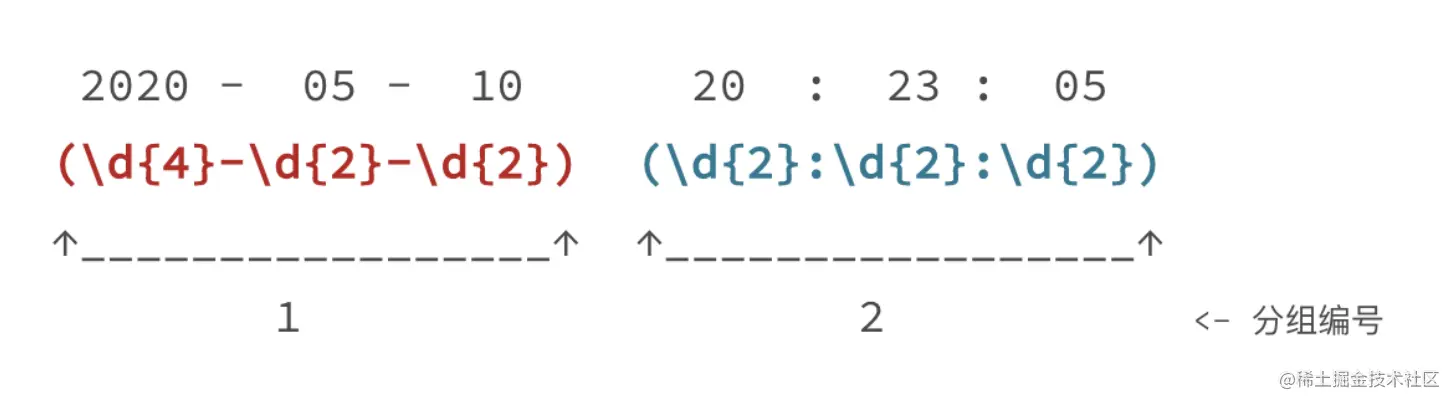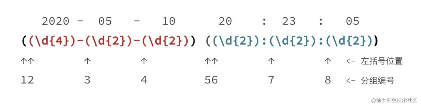 括号在正则中可以用于分组,被括号括起来的部分“子表达式”会被保存成一个子组。 那分组和编号的规则是怎样的呢?其实很简单,用一句话来说就是,第几个括号就是第几个 分组。这么说可能不好理解,我们来举一个例子看一下。 这里有个时间格式 2020-05-10 20:23:05。假设我们想要使用正则提取出里面的日期和时间。