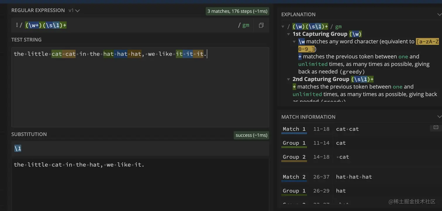 介绍了子组和引用的基本知识,现在我们来看下在正则查找时如何使用分组引用。比如 我们要找重复出现的单词,我们使用正则可以很方便地使“前面出现的单词再次出现”,具 体要怎么操作呢?我们可以使用 \w+ 来表示一个单词,针对刚刚的问题,我们就可以很容 易写出 (\w+) \1或 (\w+)\s\1这个正则表达式了。