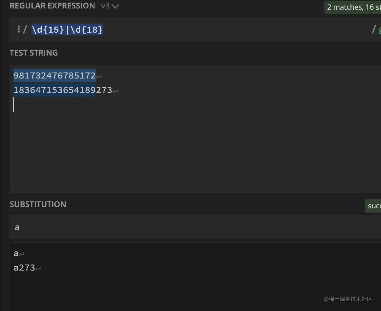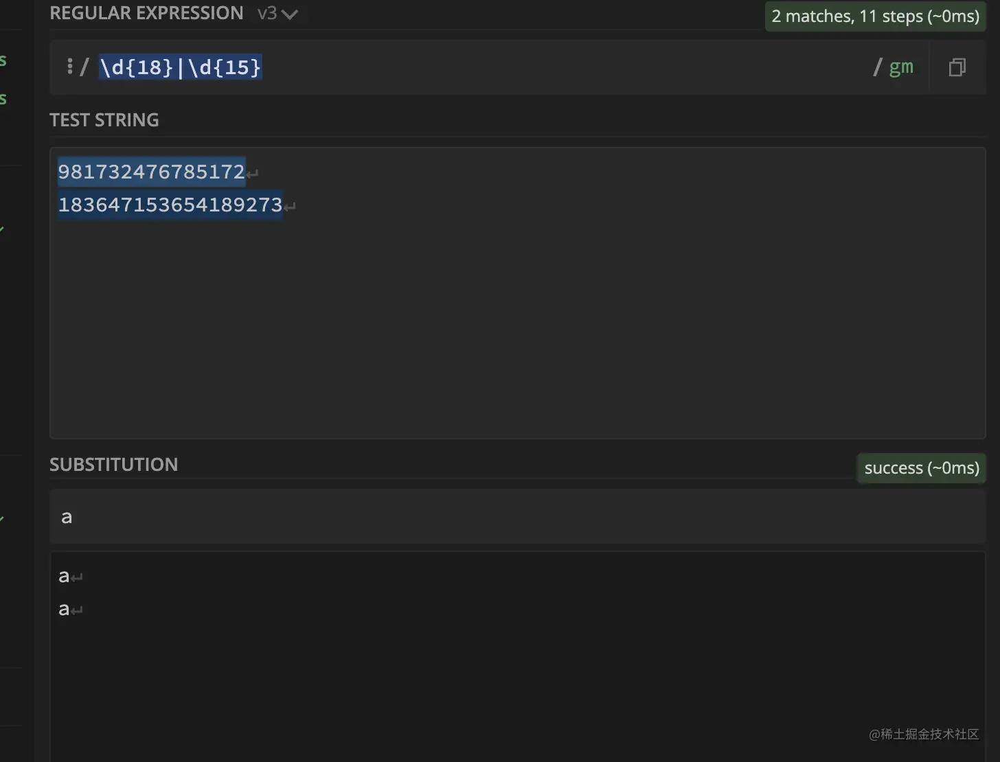 假设我们现在要去查找 15 位或 18 位数字。根据前面学习的知识,使用量词可以表示出现次数,使用管道符号可以表示多个选择,你应该很快就能写出\d{15}|\d{18}。但经过测 试,你会发现,这个正则并不能很好地完成任务,因为18位数字也会匹配上前15位,具 体如下图所示。