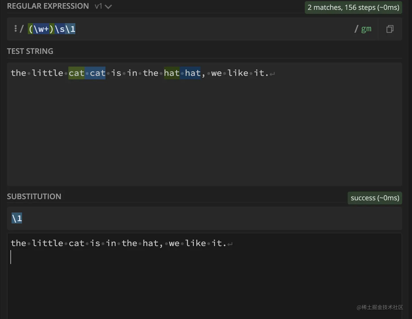 在知道了分组引用的编号 (number)后,大部分情况下,我们就可以使用 “反斜扛 + 编 号”,即 \number 的方式来进行引用,而 JavaScript 中是通过\编号来引用的,如\1