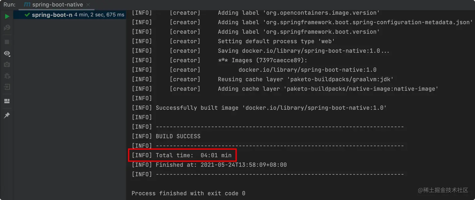 当然除了基于 Docker 镜像,还可以使用原生镜像 Maven 插件的方式,那种方式不需要 Docker,但需要安装原生镜像编译器 GraalVM,道理是一样的,这里就不再演示了,有兴趣的可以参考: