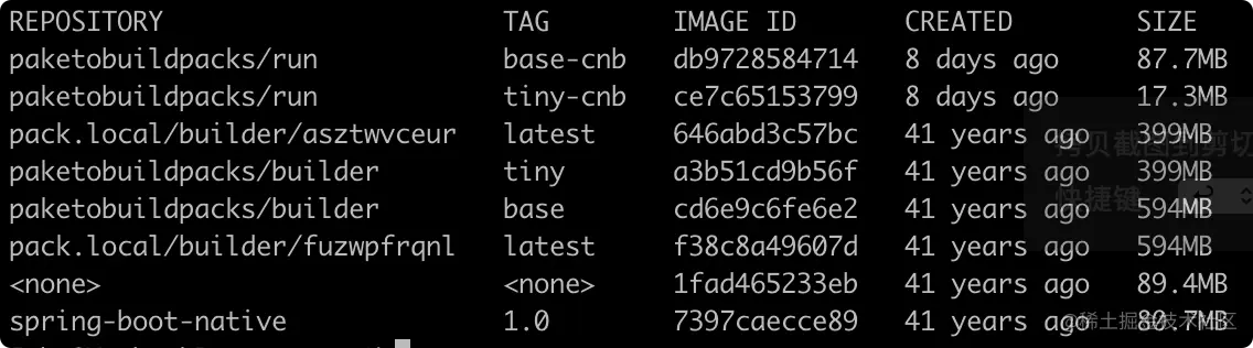 这是因为原生镜像不仅包含了应用程序中所使用到的来自 JDK、Spring 中的必须项,还包含了一个最小化的 OS 系统层,所以肯定是要比之前的要大不少。