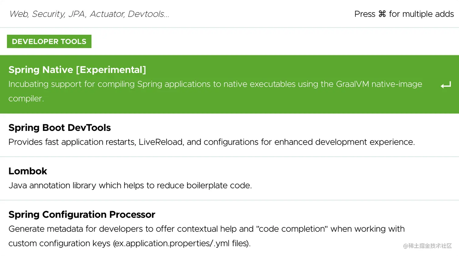 Spring Native 在 start.spring.io 上面已经可以开始使用了,在页面上添加一个 "Spring Native" 依赖进去就好,如下所示: