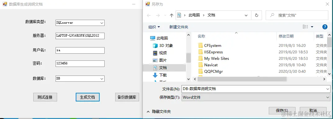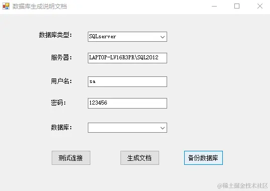 这是一款基于C#开发语言编写的数据库文档生成工具,主要实现了 SQlServer+MYsql 数据库表结构说明文档的生成,并且支持 SQLServer 数据库的备份功能,主要可以把数据库的表以及表的详细字段信息、视图、存储过程等信息导出到 Word 中,可以方便开发人员了解数据库的信息或快速编写技术说明文档。软件下载地址在文件底部,欢迎各位大神多提改进建议,不胜感激!