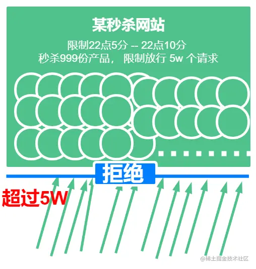 例如秒杀网站,限制22点5分 -- 22点10分 秒杀999份产品, 限制放行 5w 个请求,若在该段时间内,请求在第5w以后的请求,直接拒之门外, 也就是我们在进入网站的时候显示,系统繁忙