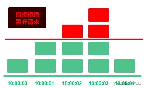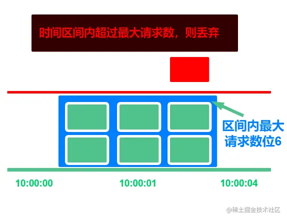 上述图,固定时间窗口来做限制,1 s只能处理2个请求,红色请求则会被直接丢弃