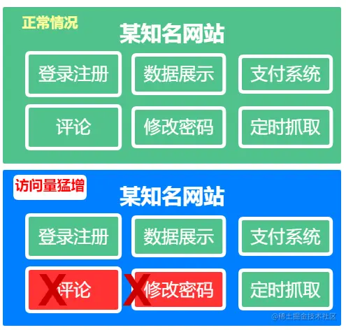 如图,某网站,当用户请求数猛增,服务器吃不消的时候,就可以选择把评论功能,修改密码等功能关闭,确保支付系统,数据系统等核心功能能够正常运行