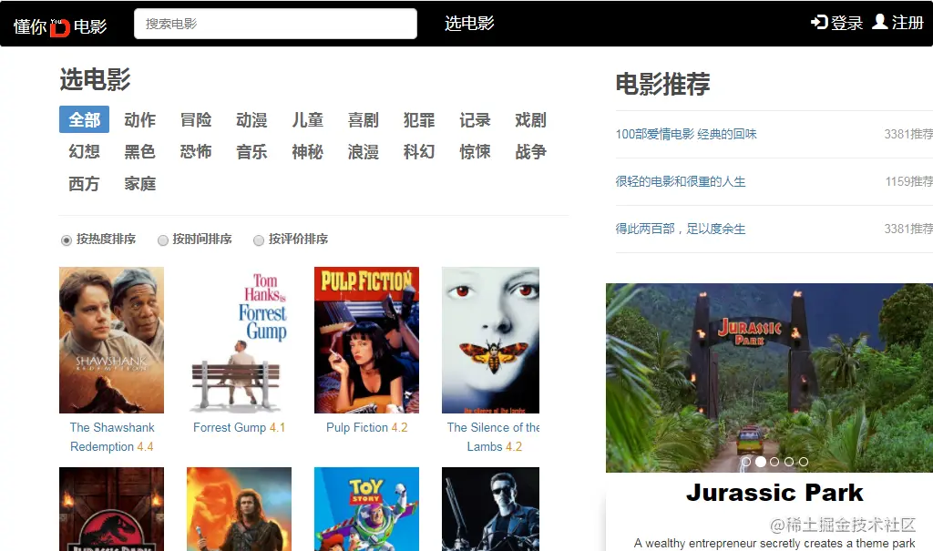 电影推荐系统中运用的推荐算法是基于协同过滤算法(Collaborative Filtering Recommendation)。协同过滤是在信息过滤和信息系统中正迅速成为一项很受欢迎的技术。与传统的基于内容过滤直接分析内容进行推荐不同,协同过滤分析用户兴趣,在用户群中找到指定用户的相似(兴趣)用户,综合这些相似用户对某一信息的评价,形成系统对该指定用户对此信息的喜好程度预测。