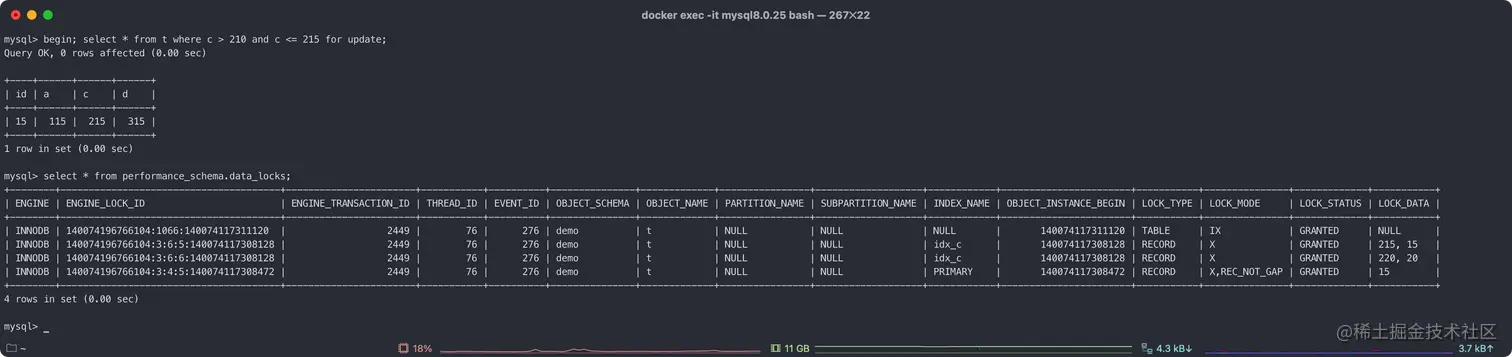 - 索引 idx_c 上添加了 215 区间的间隙锁,LOCK_MODE 为