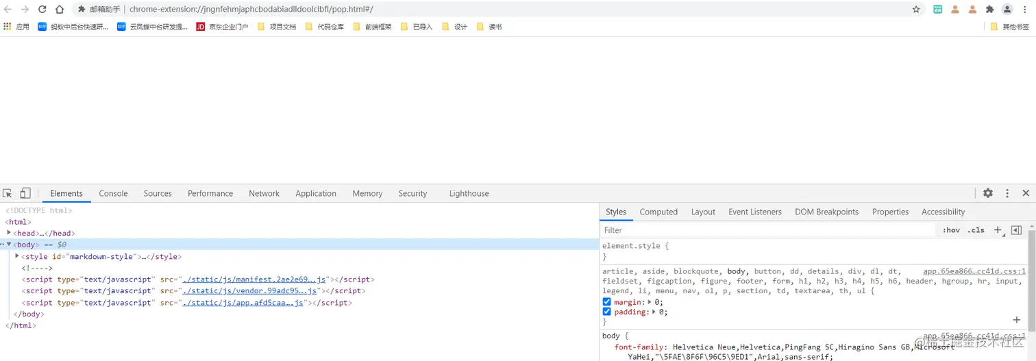 重点来了,一般的浏览器插件都是直接用原生JS或者JQUERY+html直接进行。我一直有个疑问,如果我用webpack+vue开发将打包后的静态文件直接配置上去利论上似乎也是可以的。然后上面的界面其实是build的静态页面。当我配置好manifest.json文件后,重新加载插件,神奇的事情发生了。。。