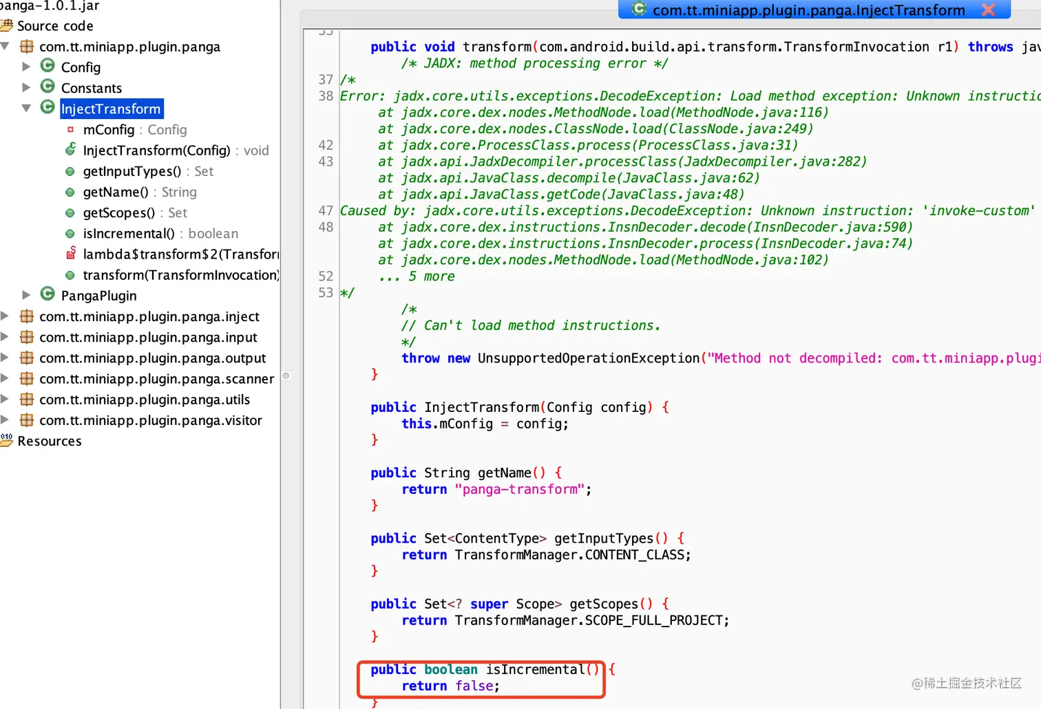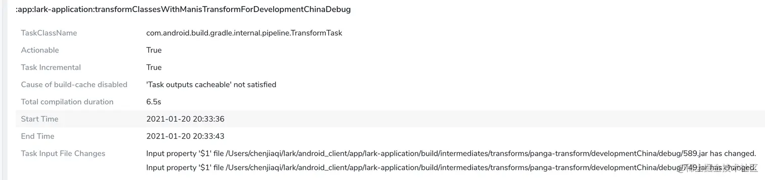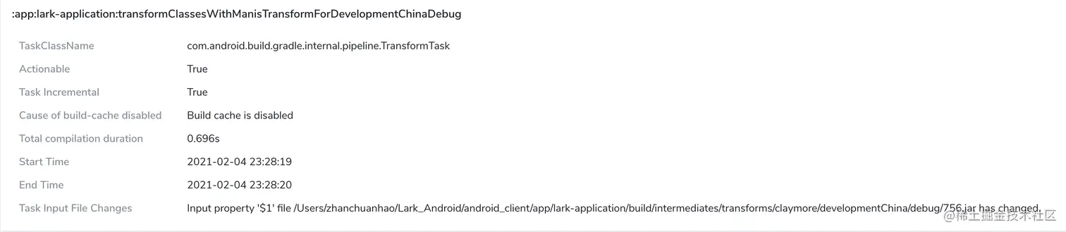 Panga是什么?据线下调研了解到,panga是飞书小程序所引入的一套DI框架,这里我们没有找到源码直接扒了下maven上的jar,发现panga每次稳定跑10于秒的原因正是其未能实现增量编译处理,在自身执行效率低下的基础上,继而又导致每次都在全量执行时也同时影响着后续注册执行的transform。