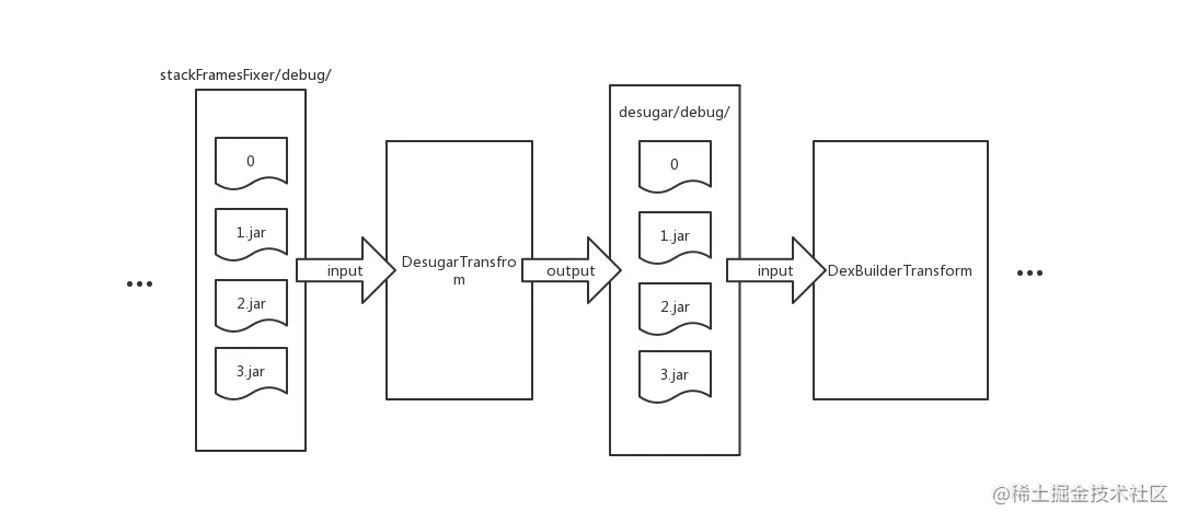 - transform的设计本身是个chain,先注册的transform task将先拿到整个构建输入,同时将自身逻辑加工后执行输出到下一个transform task上,gradle原生的transform task将会最后执行,每个环节都将直接影响到下一个transform task。