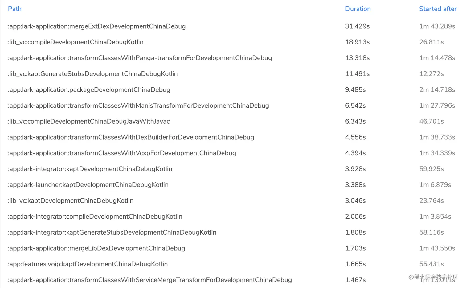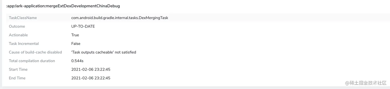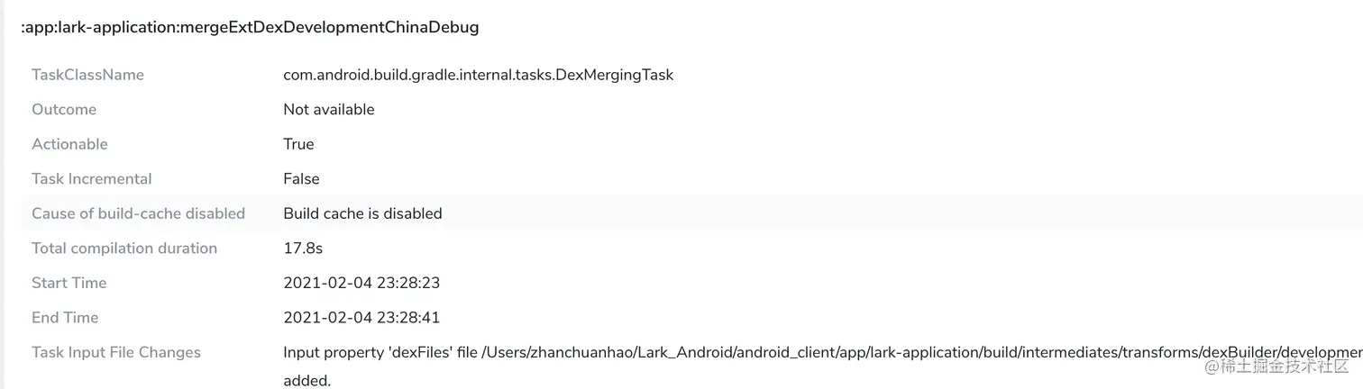 - 有几个较为明显的耗时任务,除本来就很慢的Kapt之外,在mergeExtDex、pangaTransform、manisTransform任务上耗时尤为的突出。