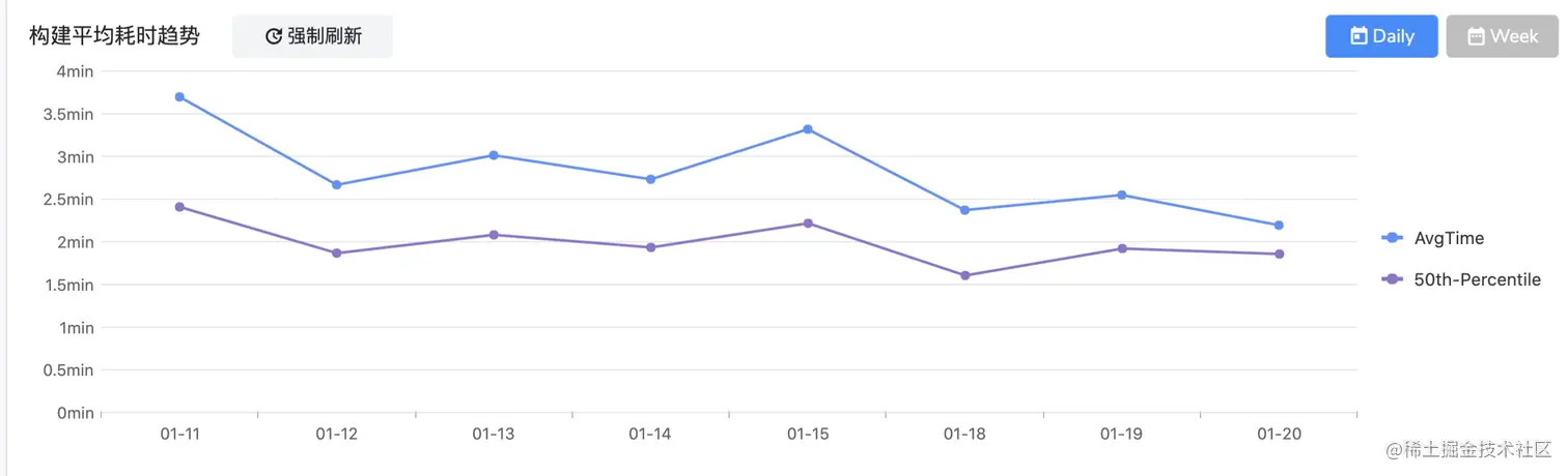 时间大概发生在1月的上旬的时间,飞书在进行了对主仓库的源码模块拆分后从构建耗时上统计看出增量的水平仍然在大概在一个较高的范围水平波动,并未达到因源码模块大量减少所应有的对编译速度上的优化预期。