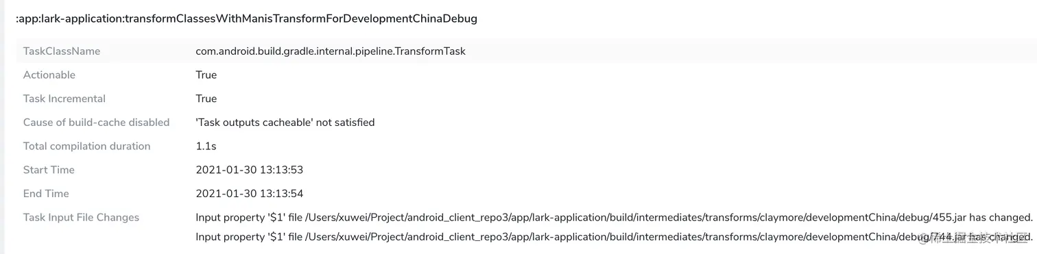 - transform在声明注册时将会声明该任务是否支持增量编译,而若其中一环遭到非增量破坏,将会影响整个chain的执行效率。
