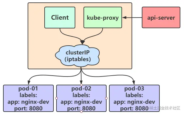 在 iptables 模式下,kube-proxy 会为 Service 后端的每个 pod 都创建对应的 iptable 规则,直接将发往 Cluster IP 的请求重定向到一个 pod IP 上。该模式下 kube-proxy 不承担四层负载均衡器的角色,只负责创建 iptables 的规则。该模式的有点便是较 userspace 模式来说效率更高,但是不能提供灵活的 LB 策略。当后端Pod不可用的时候也无法进行重试。