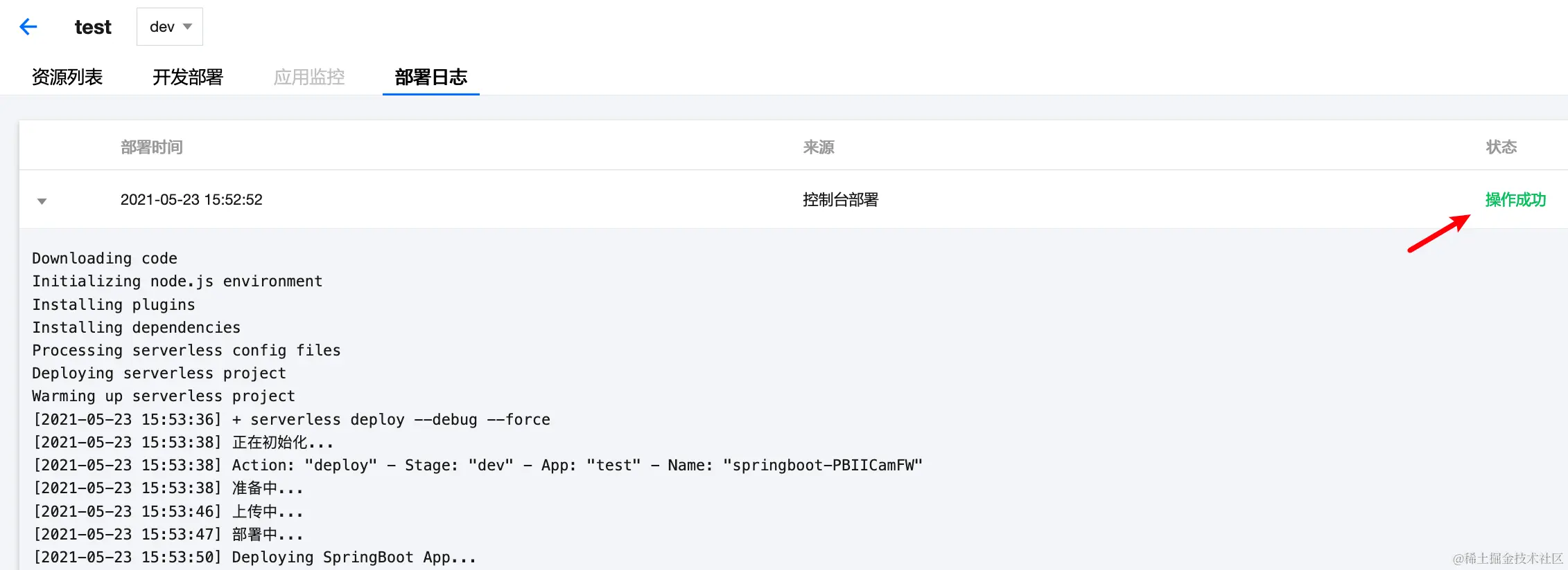 部署日志显示操作成功后,即可以对项目进行访问,来到Serverless应用界面可以查看到应用列表: