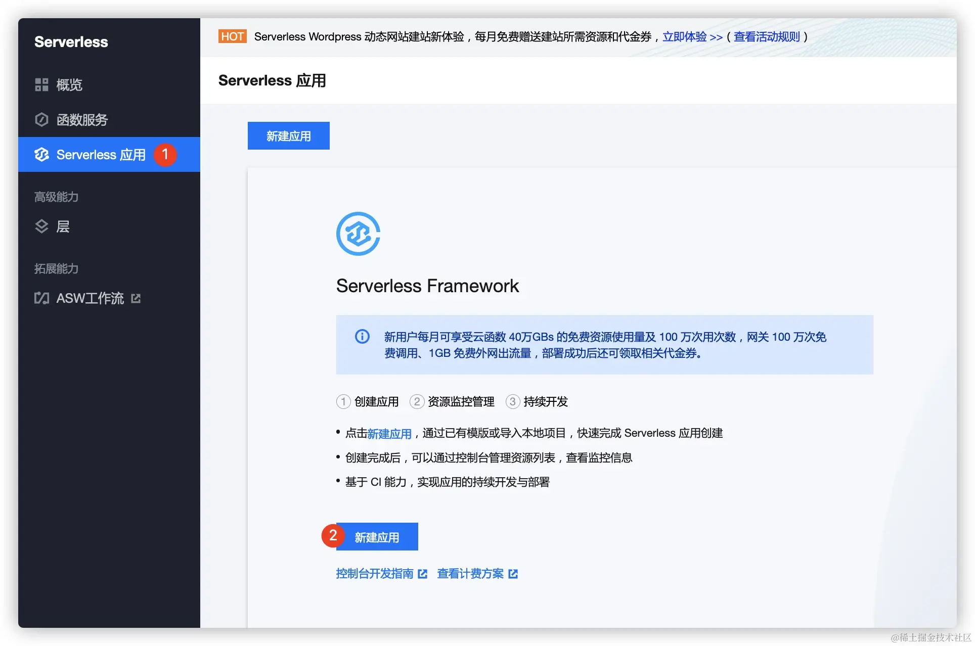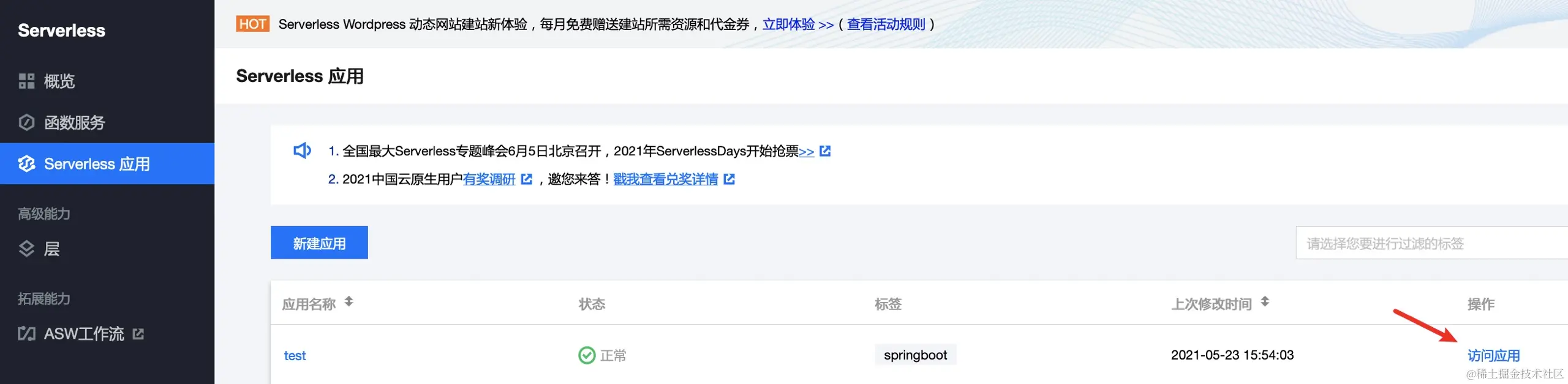 - 进入Serverless应用界面 -> 点击新建应用