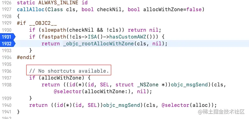 那也就是说fastpath(!cls->ISA()->hasCustomAWZ())的结果,其实就是!cls->ISA()->hasCustomAWZ()的结果。那么「第四步」就是进入if里面的_objc_rootAllocWithZone。(这一点根据断点调试也可以判断出来)