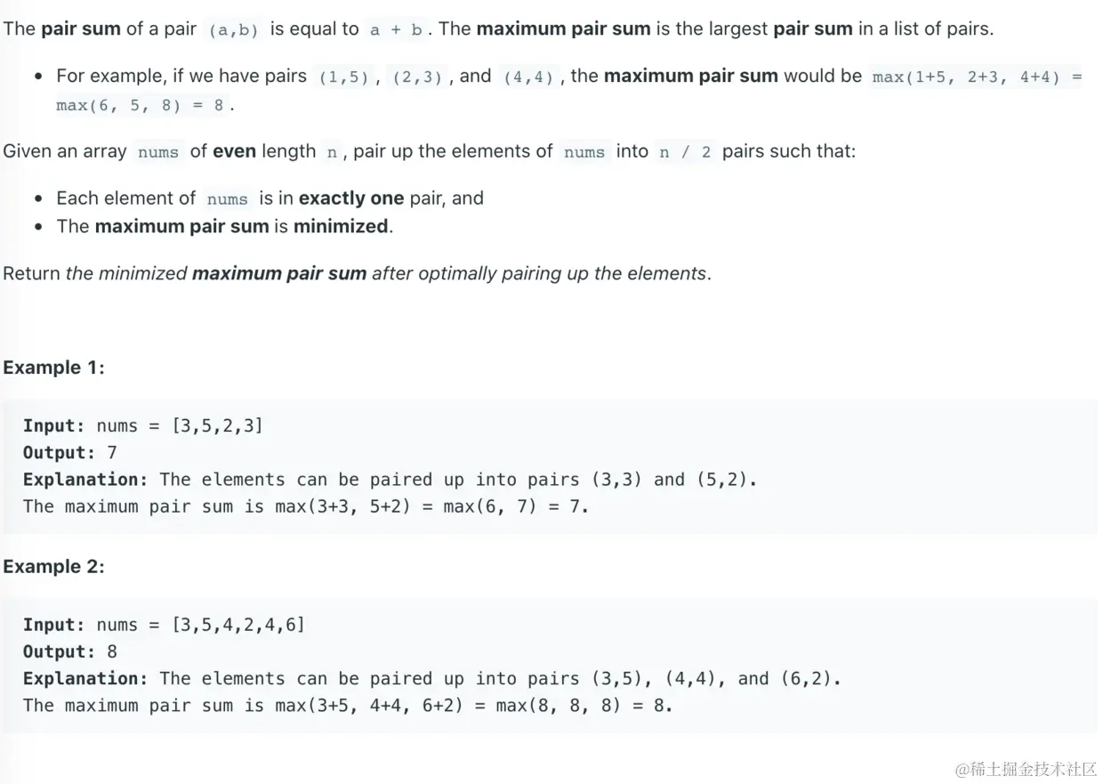 方法: 易知最大数对和最小的情况必在有序数列,无序必然导致数对和较大,所以先进行排序,然后取最大和即可。