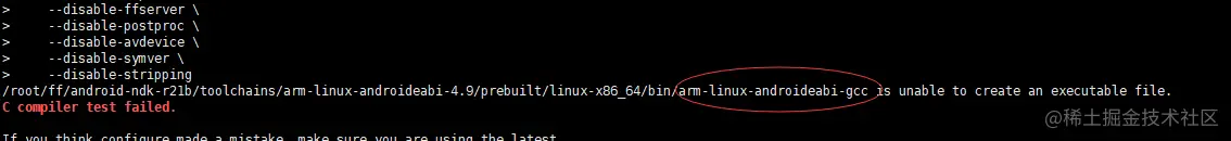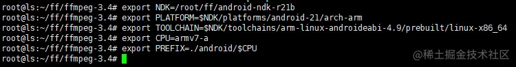 二:下面要准备编译脚本: 配置一些环境变量 #ndk目录 export NDK=/root/ff/android-ndk-r21b #架构下的so库和头文件 export PLATFORM=NDK/platforms/android-21/arch-arm #交叉编译工具 谁来用,用在哪 export TOOLCHAIN=NDK/toolchains/arm-linux-androideabi-4.9/prebuilt/linux-x86_64 #指定cpu的输出类型 export CPU=armv7-a #输出的路径 export PREFIX=./android/$CPU