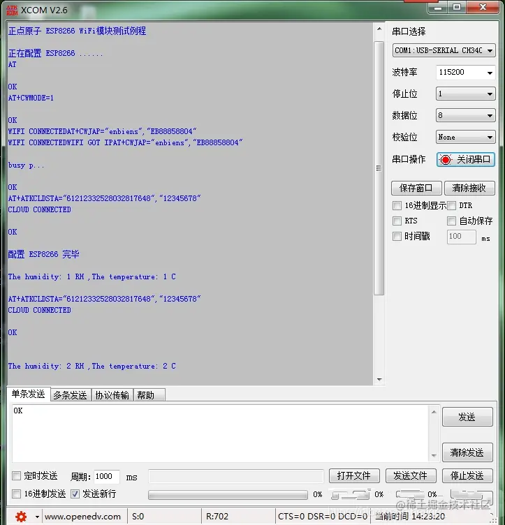 这样通过不同的函数,将不同的命令通过命令发送函数发送到串口3上,也就是发送到ESP8266模块上,从而实现ESP8266模块连接到原子云上。
