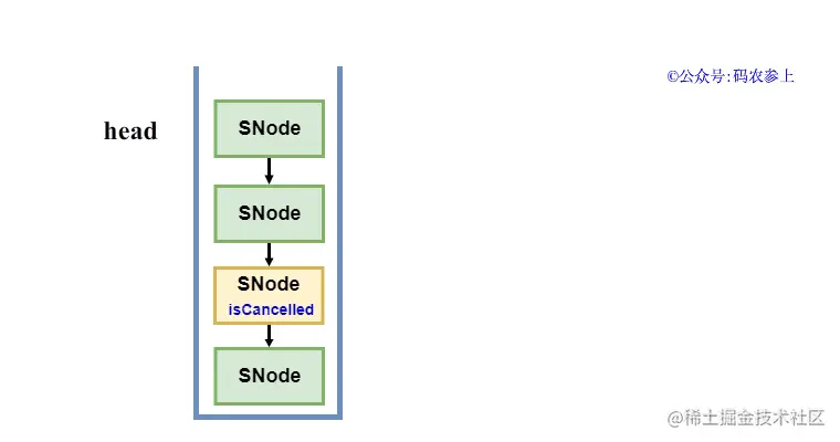 Hydra:当这两种情况出现时,SNode会将match属性设为自身,退出awaitFulfill方法,然后调用clean方法将对应的节点清理出栈。具体情形可分为两种情况。先说简单的情况,如果清理的是栈顶节点,那么直接将head节点指向它的next节点,即将当前栈顶结点弹出即可。