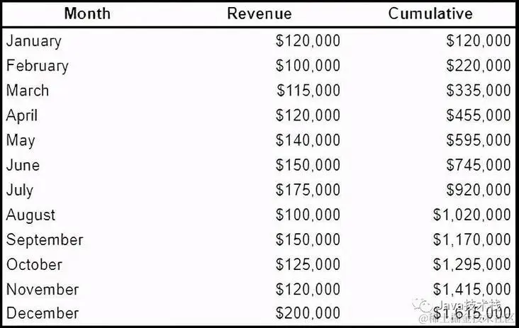 , SUM(Revenue) OVER (ORDER BY Month) AS Cumulative