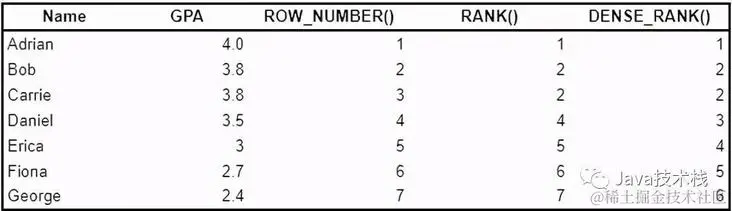 dense_rank()类似于等级(),除了重复等级后没有间隙。请注意,使用dense_rank(),Daniel排名第3,而不是第4位()。