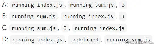 答:B,此题考查的是CommonJS中require和import的区别,import是在代码编译阶段执行的,所以会先于代码执行,但是require则不同,require是需要的时候才调用。