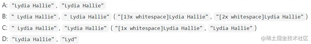 答:C,本题意在考查padStart的用法,这个API的作用是当参数大于字符串的长度时,多几个就在字符串的左侧添加几个空格,但是如果参数小于字符串的长度,则不添加。