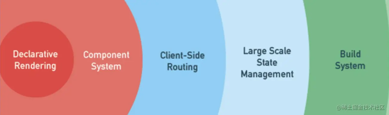 这是 Vue 与其他 JS 框架最大的不同。渐进式框架简单理解就是:你可以只用我的一部分,而非必须用我的全部;你可以仅将我作为应用的一部分嵌入,而非必须全部使用。Vue 支持你根据实际需求,在不同的阶段使用 Vue 中不同的功能,用最小最快的成本一步步搭建应用,不断渐进,而不是要求你一下子用上全家桶(vue-cli、vue-router、vuex 等)。