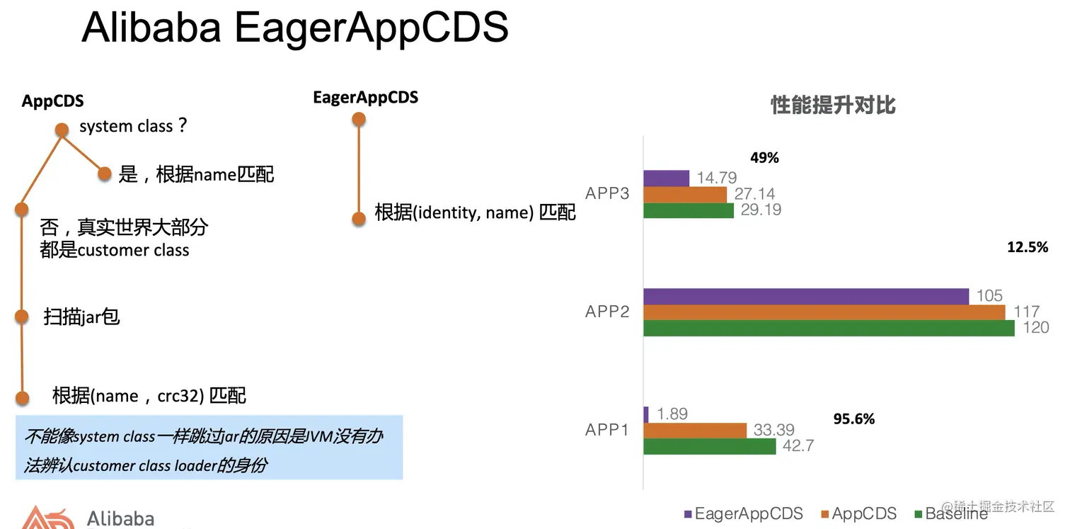 为此阿里有一套自研的Alibaba CDS,如下图,传统AppCDS中,如果是system class直接根据name匹配,如果是Custom Class就需要扫描Jar包,Jar包本质是一个Zip包,这就需要大量IO操作去加载,性能当然不会好。