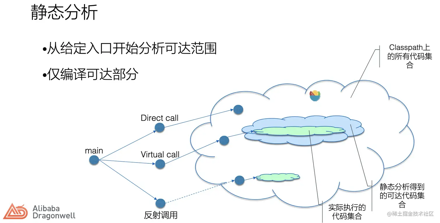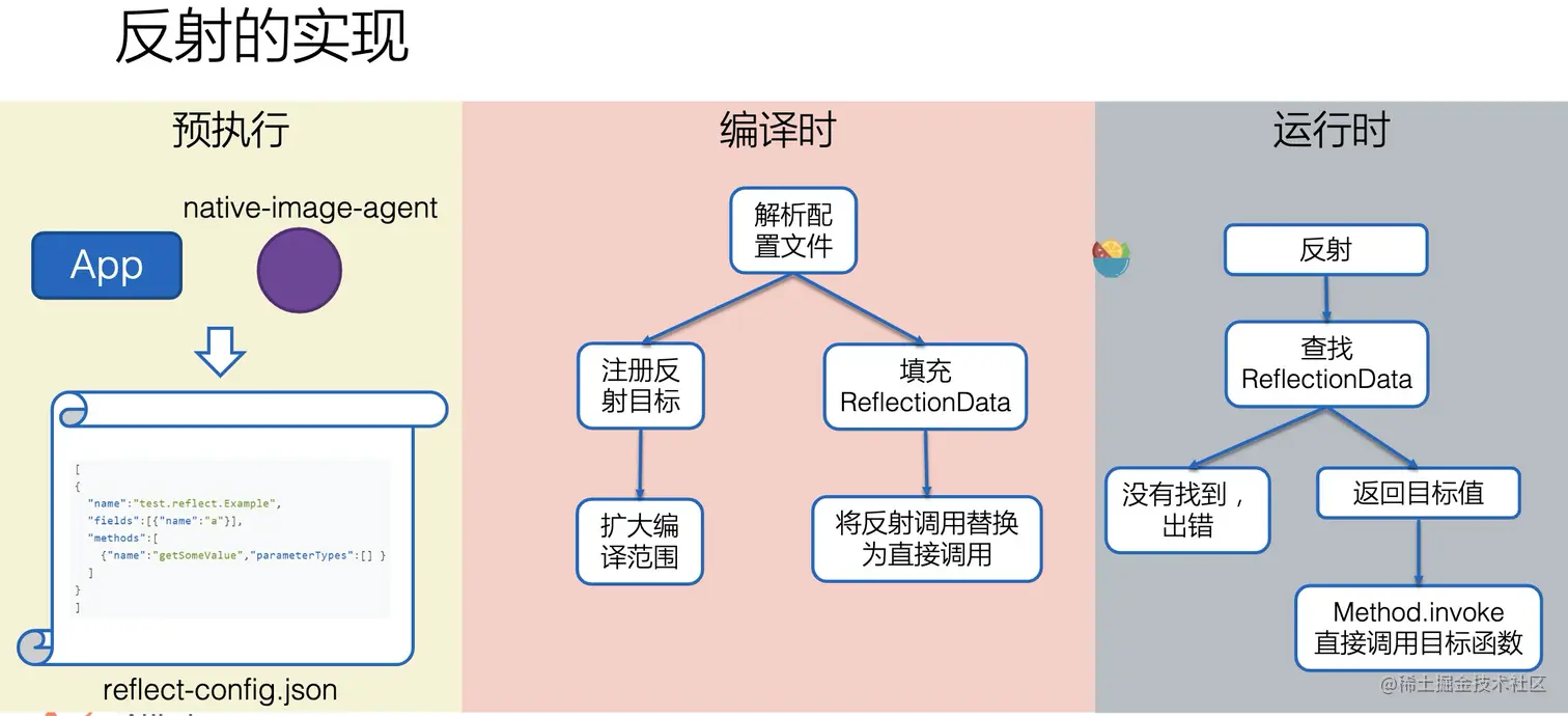 针对反射的情况,Graal VM通过预执行给出了需要反射加载的类与方法,编译时填充到缓冲区RelectionData,并且将反射替换为直接方法调用,在运行时从缓存中查找执行。
