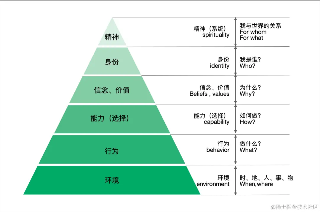 加强团队文化建设同样重要,其关键在于清晰定义团队价值观,并能够自上而下地贯彻执行。价值观的重要性不言而喻,从 NLP 神经逻辑层次模型可以看到,上三层的所代表的的价值观可以影响人的行为与团队环境。