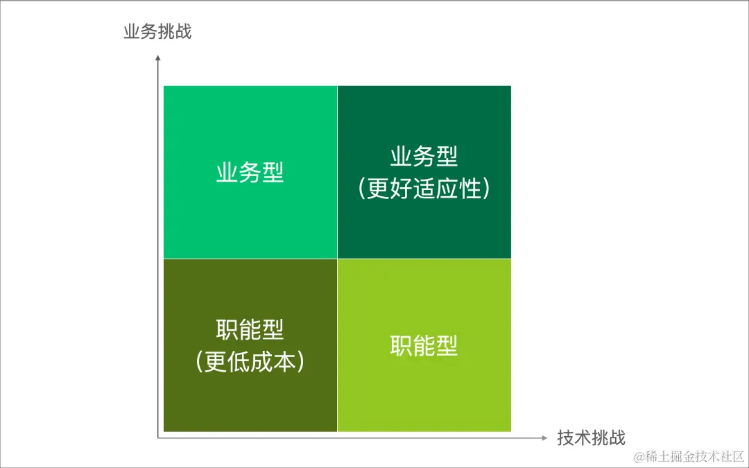 随着组织发展阶段的变化,组织架构设计也是动态的。那么如何选择适合团队当前阶段的组织架构呢?我们可以分析团队当前面临的「业务挑战」和「技术挑战」难度,选择相应的组织架构形式。
