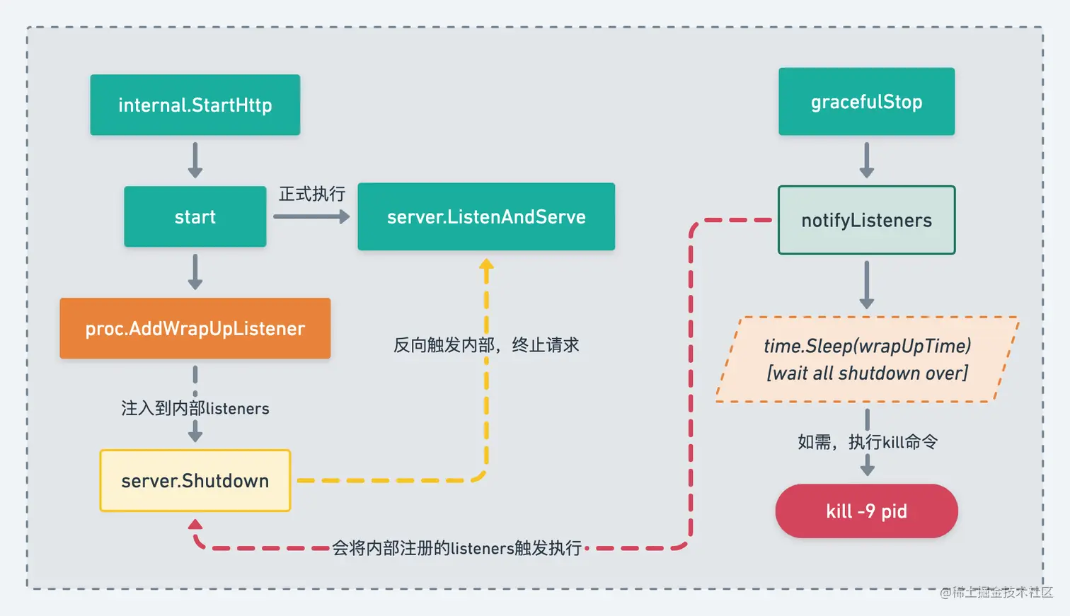 wrap up,关闭目前服务请求,以及资源time.Sleep(),等待资源处理完成,以后关闭完成shutdown,通知退出- 如果主goroutine还没有退出,则主动发送 SIGKILL 退出进程