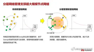 为满足超大规模网络节点的需求,提出了分层网络的能力。传统区块链节点网络,随着节点数量增加,节点的性能呈现线性衰减,节点数量越多,性能相对越差。因为交易量也很大,它整个的这个数据同步都是通过 gossip 的协议进行数据同步, gossip 协议存在了很多的冗余的消息。对此,华为云区块链构建了一种分层的网络规模体系,通过分层算法以及动态分发,动态分发消息的协议来构建数据,从核心慢慢的向边缘节点做一个扩散,同时减少消息发送过程中冗余的消息数量,减少对性能的影响。