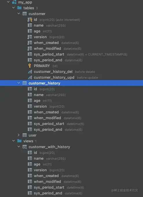 - customer表会增加"sys_period_start"和"sys_period_end"两个字段,以及"customer_history_del"和"customer_history_upd"两个触发器