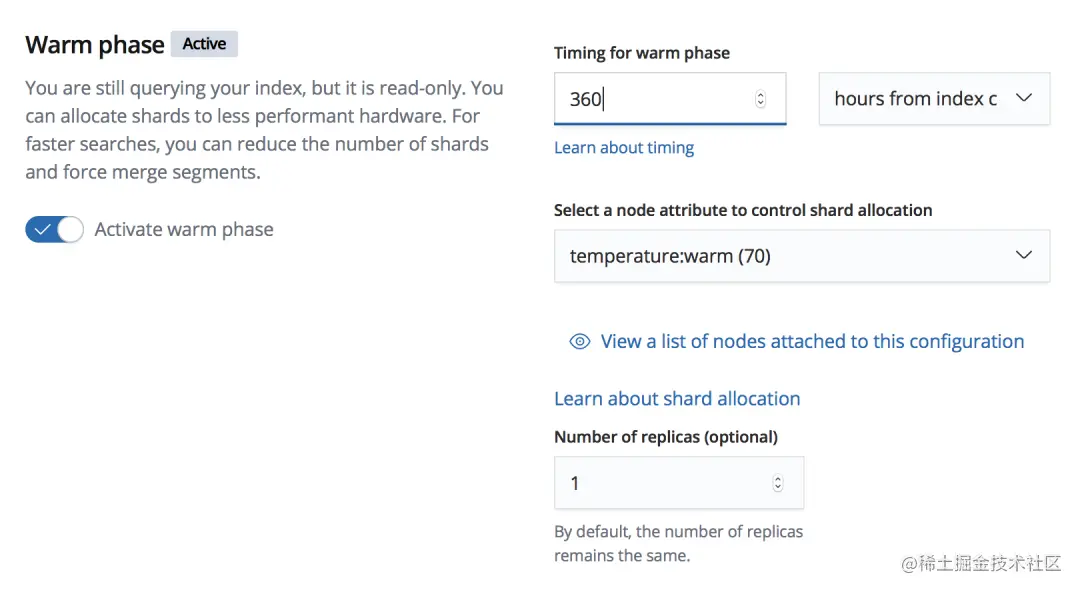 在 warm phase, 把创建时间超过 360 小时的索引从 hot 节点迁移到 warm 节点上,保持索引的副本数量为 1。之所以使用 360 小时作为条件,而不是 15 天作为条件,是因为客户的索引是按小时创建的,如果以 15 天作为迁移条件,则在每天凌晨都会同时触发 15 天前的 24 个索引一共 24*120=2880 个分片同时开始迁移索引,容易引发前文介绍的由于迁移分片数量过多导致创建索引被阻塞的问题。所以以 360 小时作为条件,则在每个小时只会执行一个索引的迁移,这样把 24 个索引的迁移任务打平,避免其它任务被阻塞的情况发生。