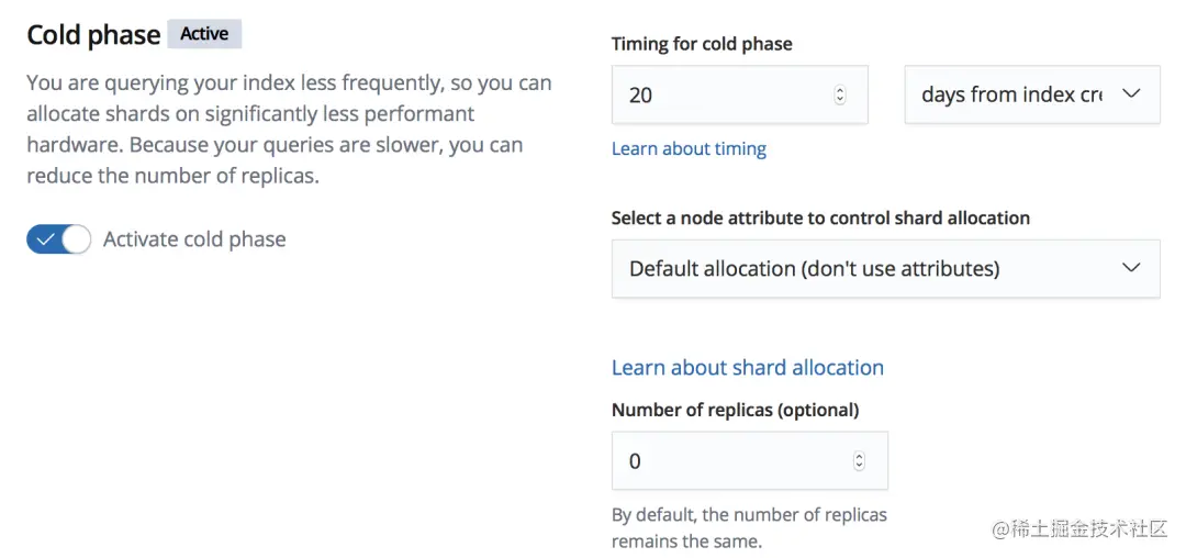 此处的 timing 是创建时间 20 天后,需要保证在第二步骤中,对过去老索引数据备份先执行完成后才可以进入到 cold phase.
