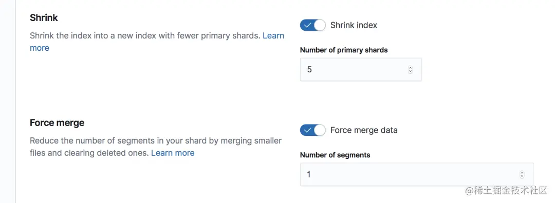 同时,也在 warm phase 阶段,设置索引 shrink,把索引的分片数缩成 5 个,因为老的索引已经不执行写入了,所以也可以执行 force merge, 强制把 segment 文件合并为 1 个,可以获得更好的查询性能。